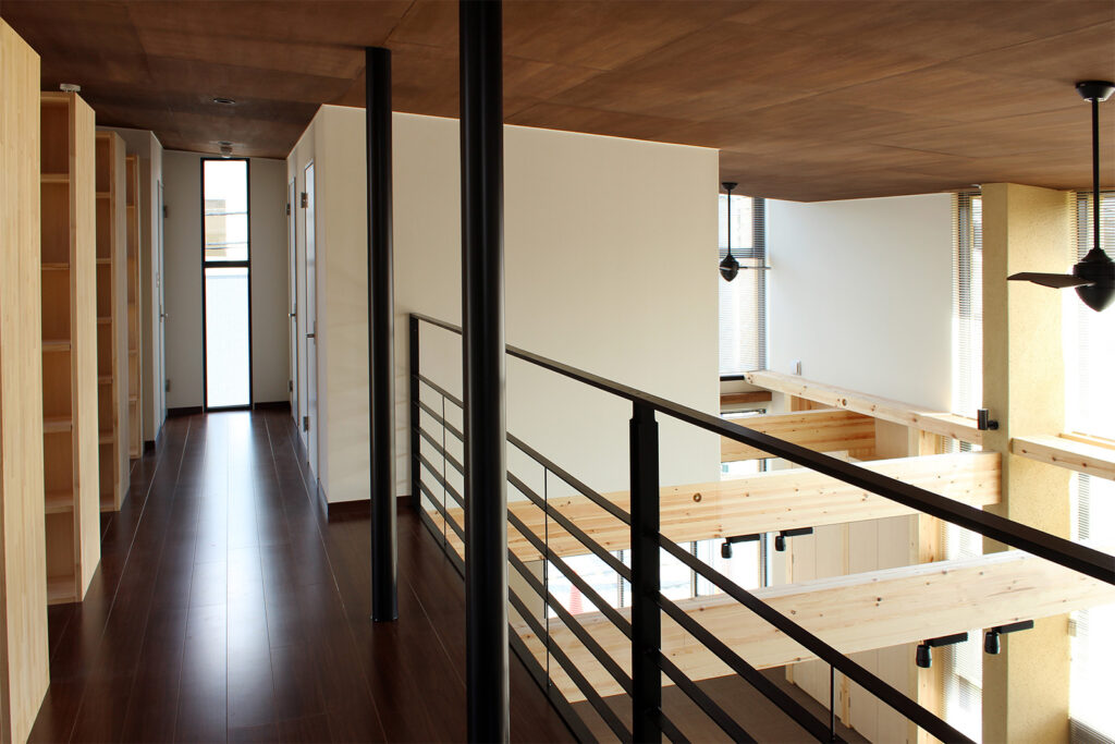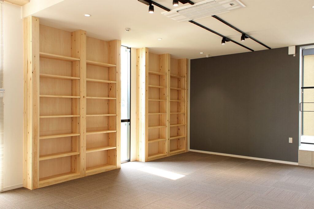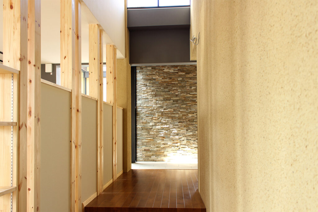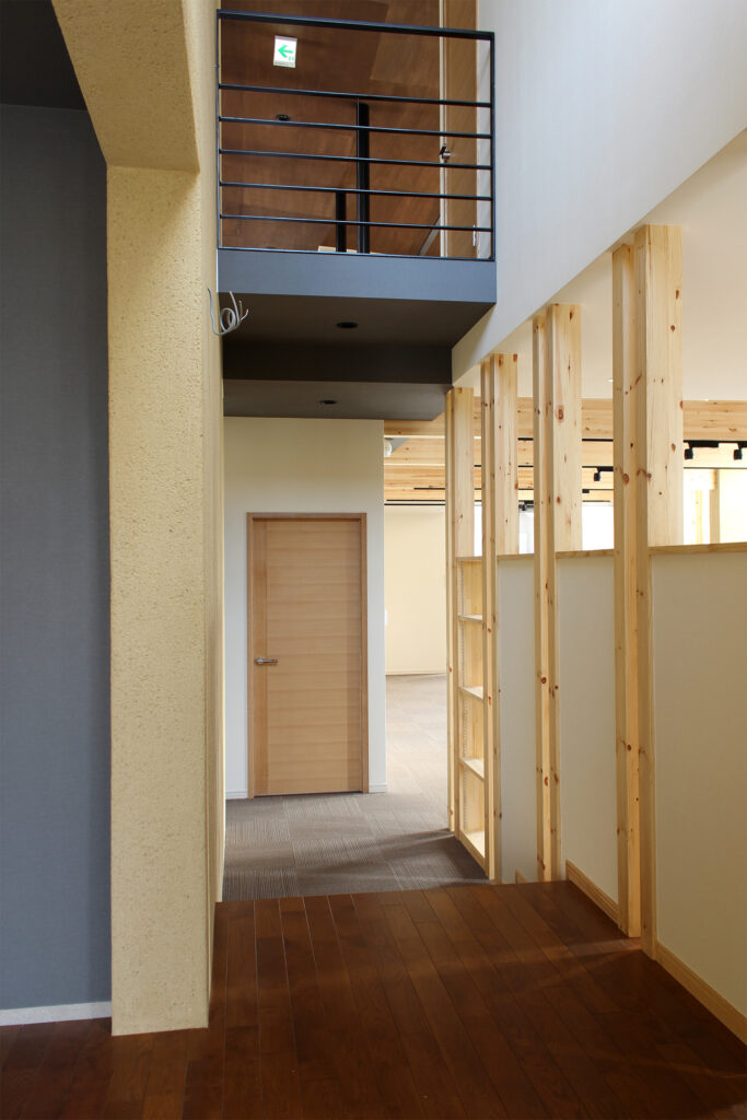 敷地は幹線道路と住宅地側の道路に面していますが、約80cmの高低差があり、その扱いが計画の大きなポイントとなりました。来られる方の負担をできるだけ減らしたいという思いから、バリアフリーで出入りできる動線を整えています。室内は、光をたっぷりと取り込み、気持ちよく過ごせる仕事場となることを意識しました。素材には石や左官の掻き落とし、木材を用い、落ち着きのあるやわらかな空間をつくっています。吹き抜けを支える柱は書棚として活かし、庇のH鋼には樋の役割も持たせるなど、機能と意匠が自然につながるように計画しています。